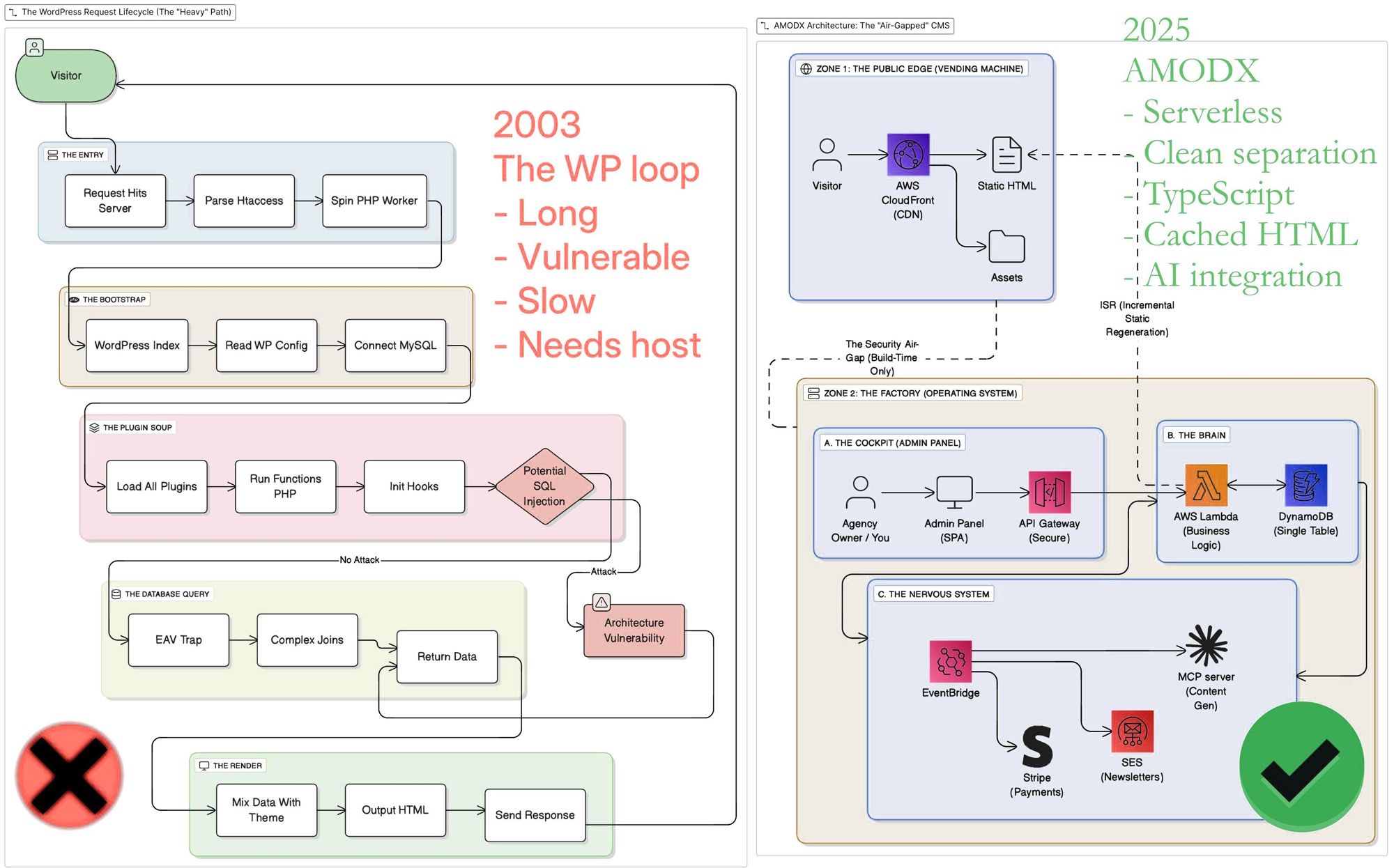 WordPress is expensive when you count labor. AMODX is cheap when you own the stack.